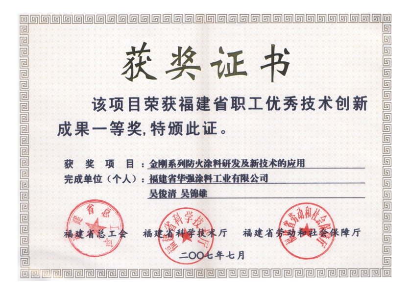 2007年榮獲福建省職工優(yōu)秀技術(shù)創(chuàng)新成果一等獎