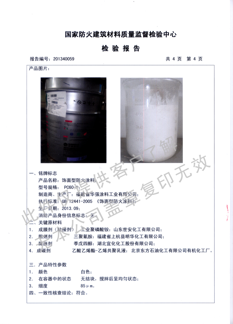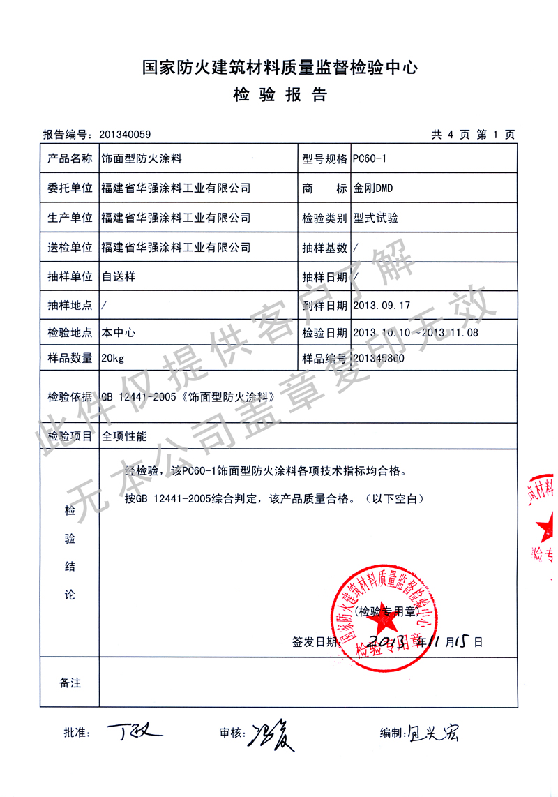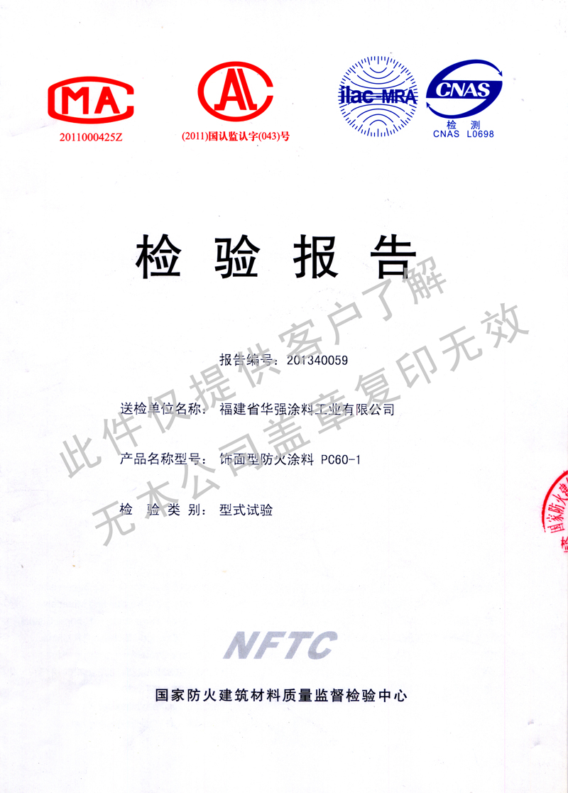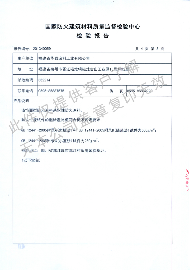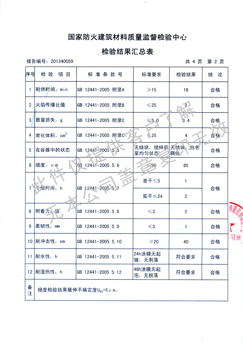 國家防火建筑材料質(zhì)量檢驗檢測中心檢測通過的《檢驗報告》。